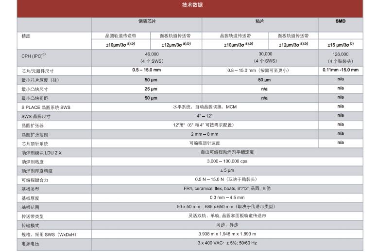 • 4個SIPLACE SpeedStar貼裝頭支持高精度貼裝,每小時貼裝高達126,000個SMT元器件、46,000個倒裝芯片或30,000個裸芯片