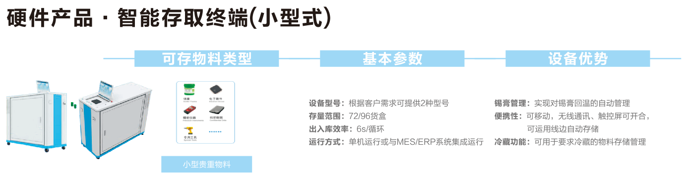 小型一對一智能存取終端,可實現對錫膏回溫的自動管理,可移動,無線通訊、觸控屏可開會,可運用線邊自動存儲。可用於要求冷藏的物料存儲管理。