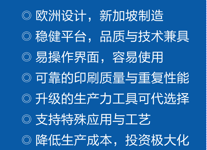 Eby DEK印刷機,歐洲設計,新加坡製造。穩健平台,品質與技術兼具,易操作界麵和容易使用。可靠的印刷質量與重複性能。